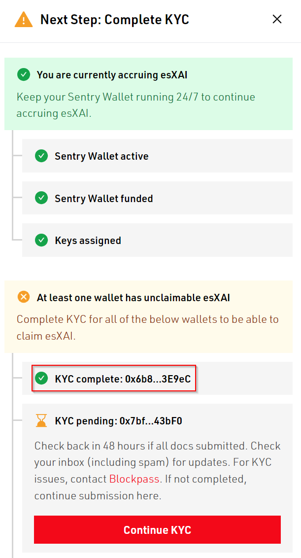* If you see "KYC pending", read more about how to interpret a pending KYC status [**here**](https://xai-foundation.gitbook.io/xai-network/kn/about-xai/sentry-key-purchase-and-setup/step-4-complete-kyc-or-kyb-to-claim-xai-redemptions/how-to-interpret-a-pending-kyc-status).