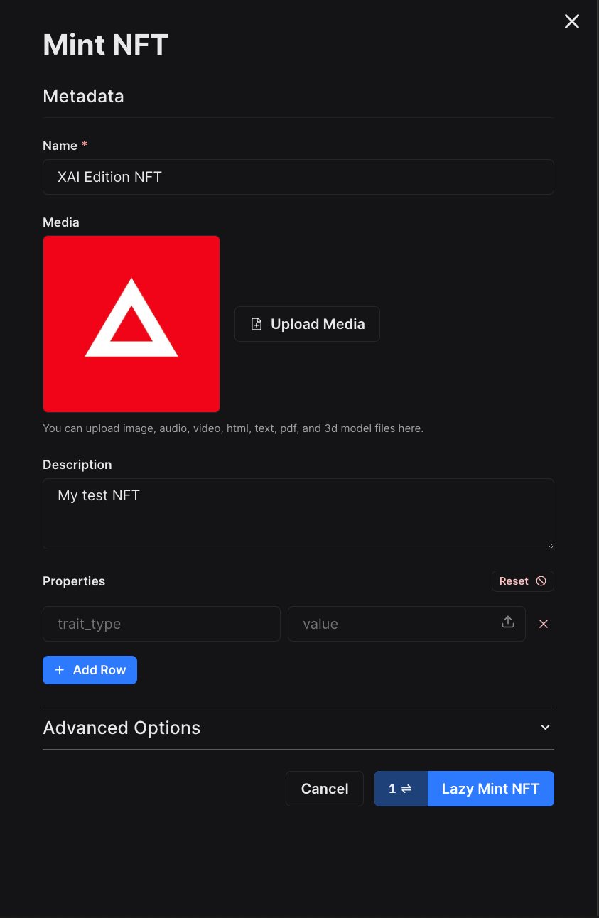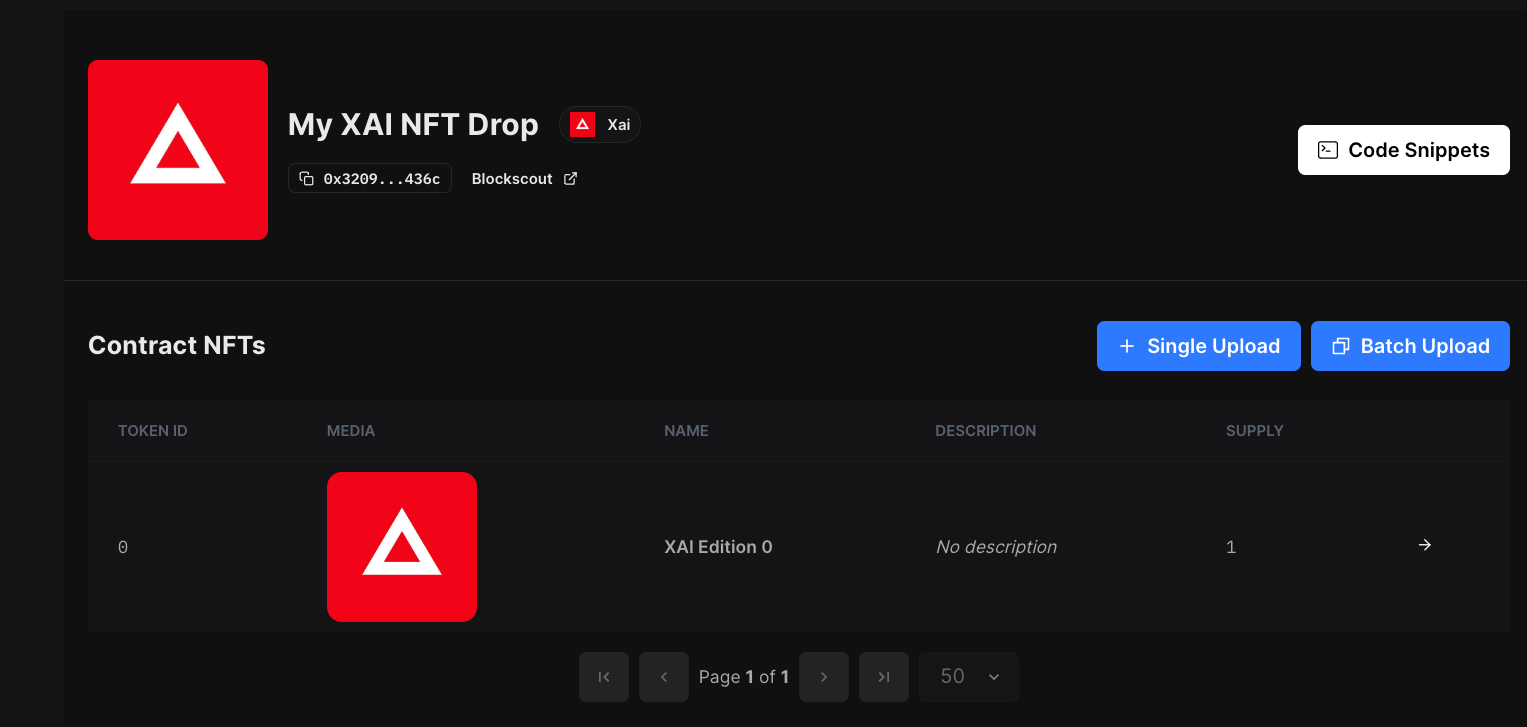 5. Go the NFTs tab and click “Single Upload” to configure the first token in your NFT collection. Give your NFT a name, image and description. Click “Lazy Mint NFT” to lazy mint your NFT.