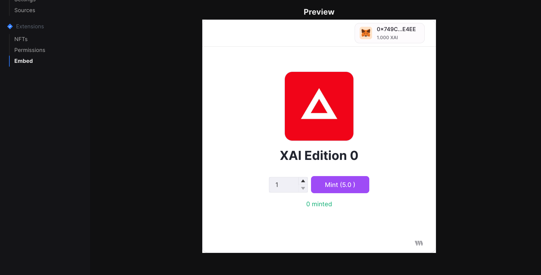 5. Click on the embed tab and claim one of your NFTs. Your wallet will be prompted and you will see it being charged for 5 XAI test token. Confirm the transaction in your wallet.