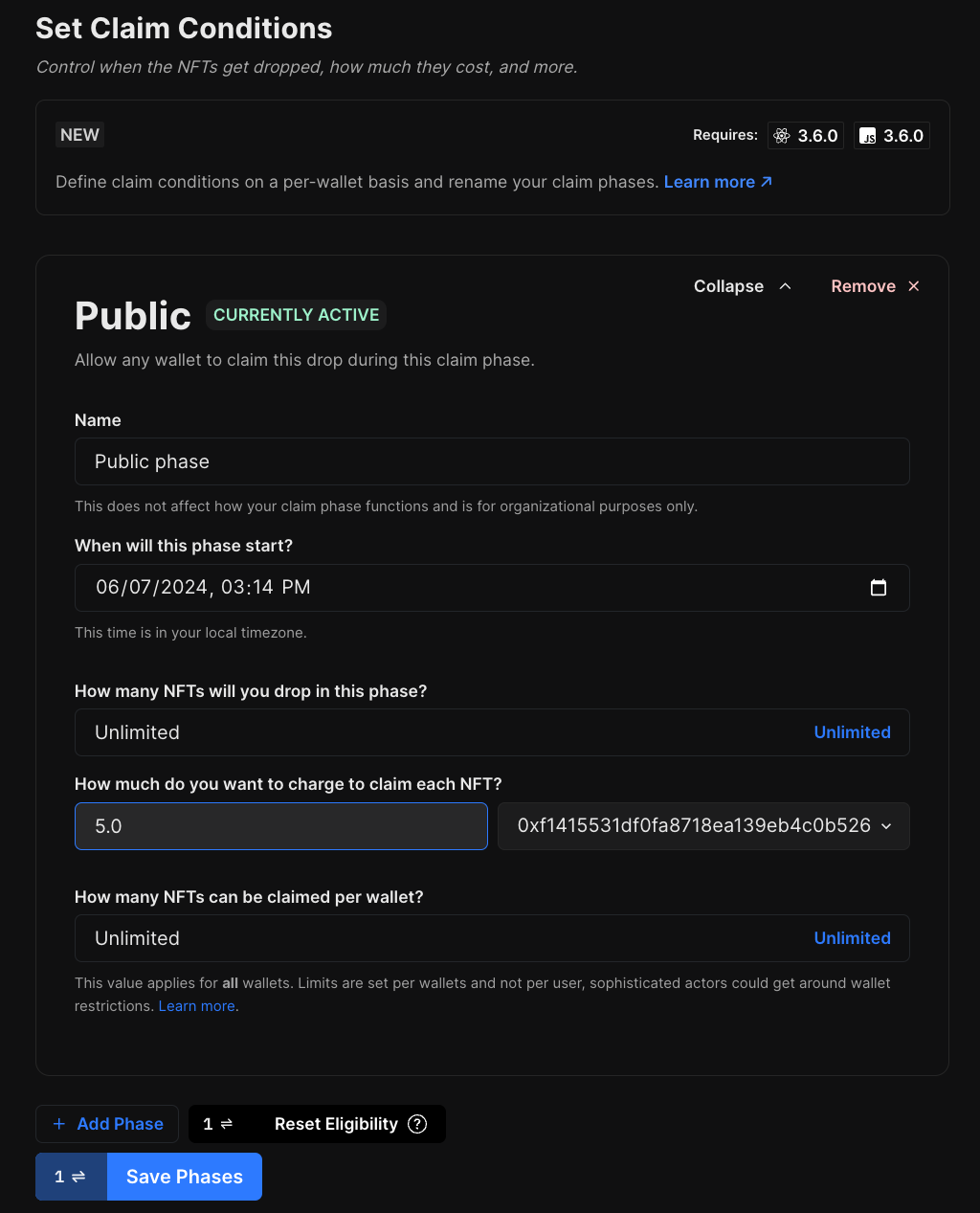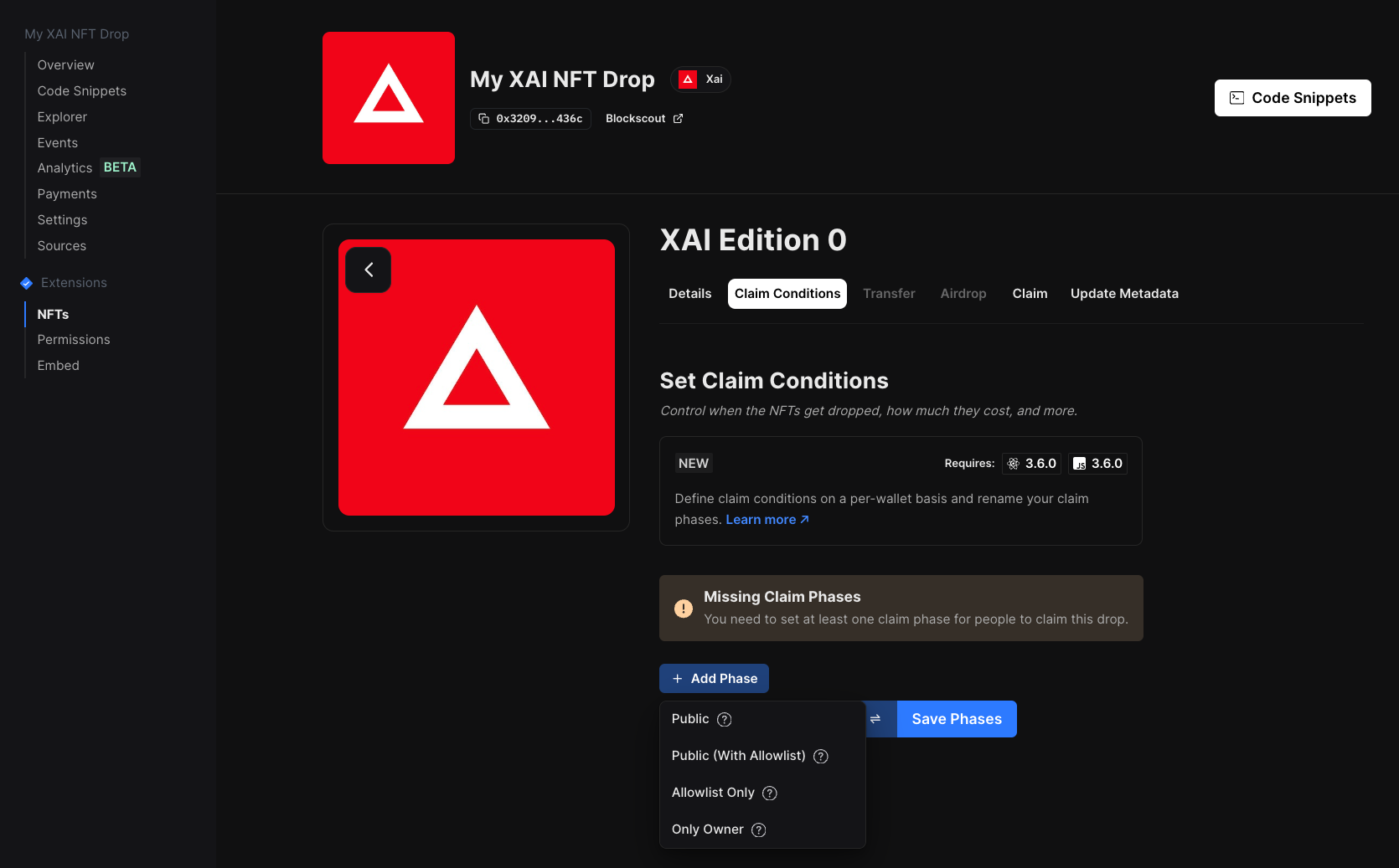 1. On the NFTs tab, click on your NFT row and click on Claim Conditions tab