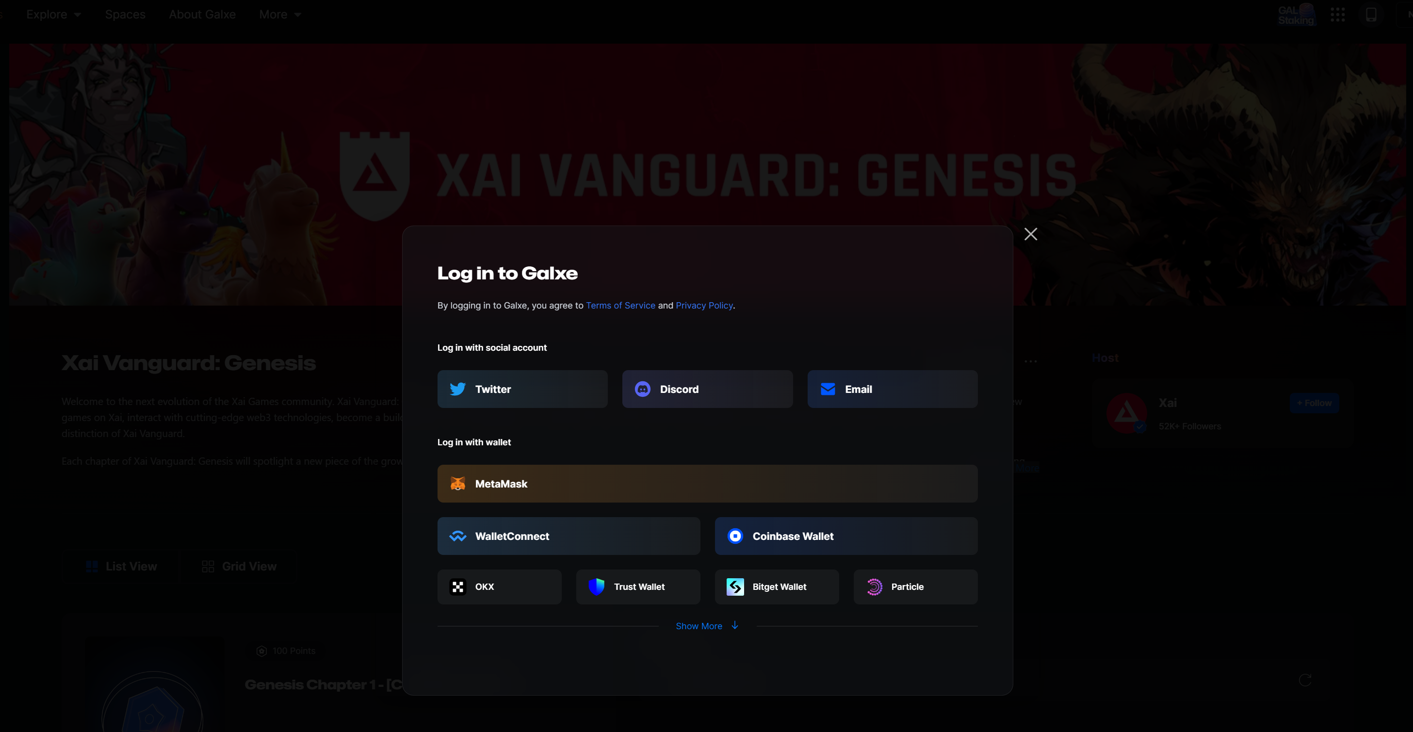 To participate in Xai Vanguard: Genesis, you will need to complete quests on Galxe which can be found here: <https://app.galxe.com/quest/xaigames/GCzuatdz2R>.