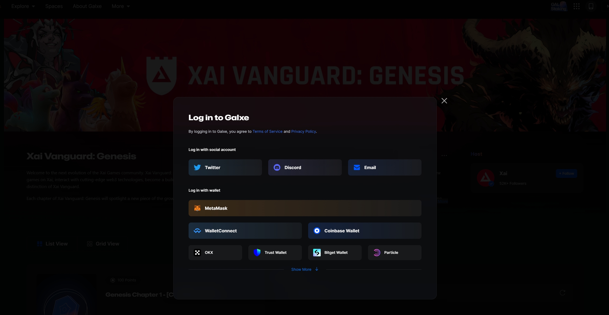 To participate in Xai Vanguard: Genesis, you will need to complete quests on Galxe which can be found here: https://app.galxe.com/quest/xaigames/GCzuatdz2R.